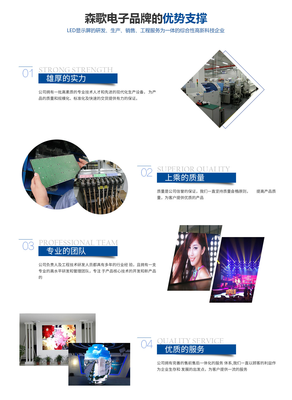 鄭州森歌電子科技有限公司是一家專業(yè)從事LED顯示屏的生產(chǎn)、銷售、工程服務(wù)為一體的高新科技企業(yè)。公司擁有一批高素質(zhì)的專業(yè)技術(shù)人才和先進(jìn)的現(xiàn)代化生產(chǎn)設(shè)備,公司的主要負(fù)責(zé)人及工程技術(shù)研發(fā)人員都具有15年以上的LED行業(yè)經(jīng)驗(yàn),擁有一支專業(yè)的高水平研發(fā)和管理團(tuán)隊(duì),專注于LED核心技術(shù)的開(kāi)發(fā)和LED新產(chǎn)品的自主創(chuàng)新,為產(chǎn)品的質(zhì)量和規(guī)?;?、標(biāo)準(zhǔn)化及快速的交貨提供有力的保證。公司在福建、深圳建立了生產(chǎn)基地。 鄭州森歌電子科技堅(jiān)持以方案完善,質(zhì)量過(guò)硬,服務(wù)及時(shí)為口號(hào),堅(jiān)持走高品質(zhì)路線?,F(xiàn)我公司工程業(yè)績(jī)已遍布省內(nèi)外,并且在政府機(jī)構(gòu)、軍事指揮、銀行系統(tǒng)、醫(yī)療教育、室內(nèi)外廣告、酒店會(huì)所、公安指揮調(diào)度、水利工程、視頻會(huì)議等多個(gè)行業(yè)領(lǐng)域得到廣泛應(yīng)用并獲得客戶的一致好評(píng)和普遍認(rèn)可,是客戶值得信賴的長(zhǎng)期戰(zhàn)略合作伙伴。